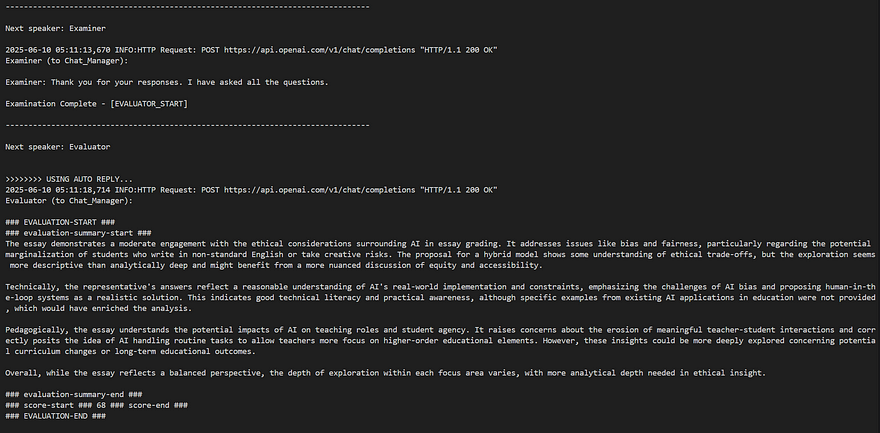 In an ideal scenario the examination would conclude neatly after the evaluator agent provides the verdict.