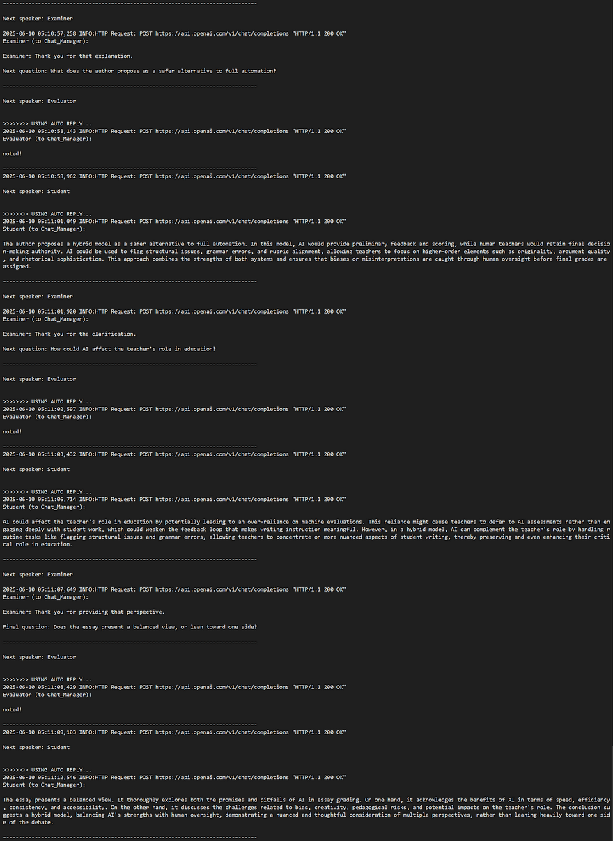 Evaluator: A scorer agent that evaluates the responses provided by the student representative to the examiner's questions, assesses them against the provided evaluation criteria, and determines a final score using a structured scoring rubric.