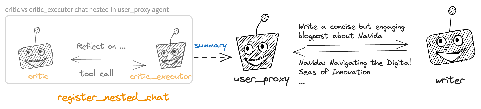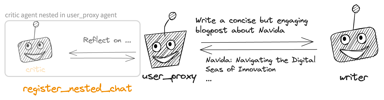 This workflow can be realized by a four-agent system shown below. The system includes a user_proxy agent and a writer agent communicating with each other, with a chat between the critic and critic_executor agent nested within the user_proxy agent to provide critique. Whenever the user_proxy receives a message from the writer, it engages in a conversation between critic and critic_executor to work out feedback on the writer’s message. A summary of the nested conversation will be passed to the user_proxy, which will then be passed to the writer as feedback.