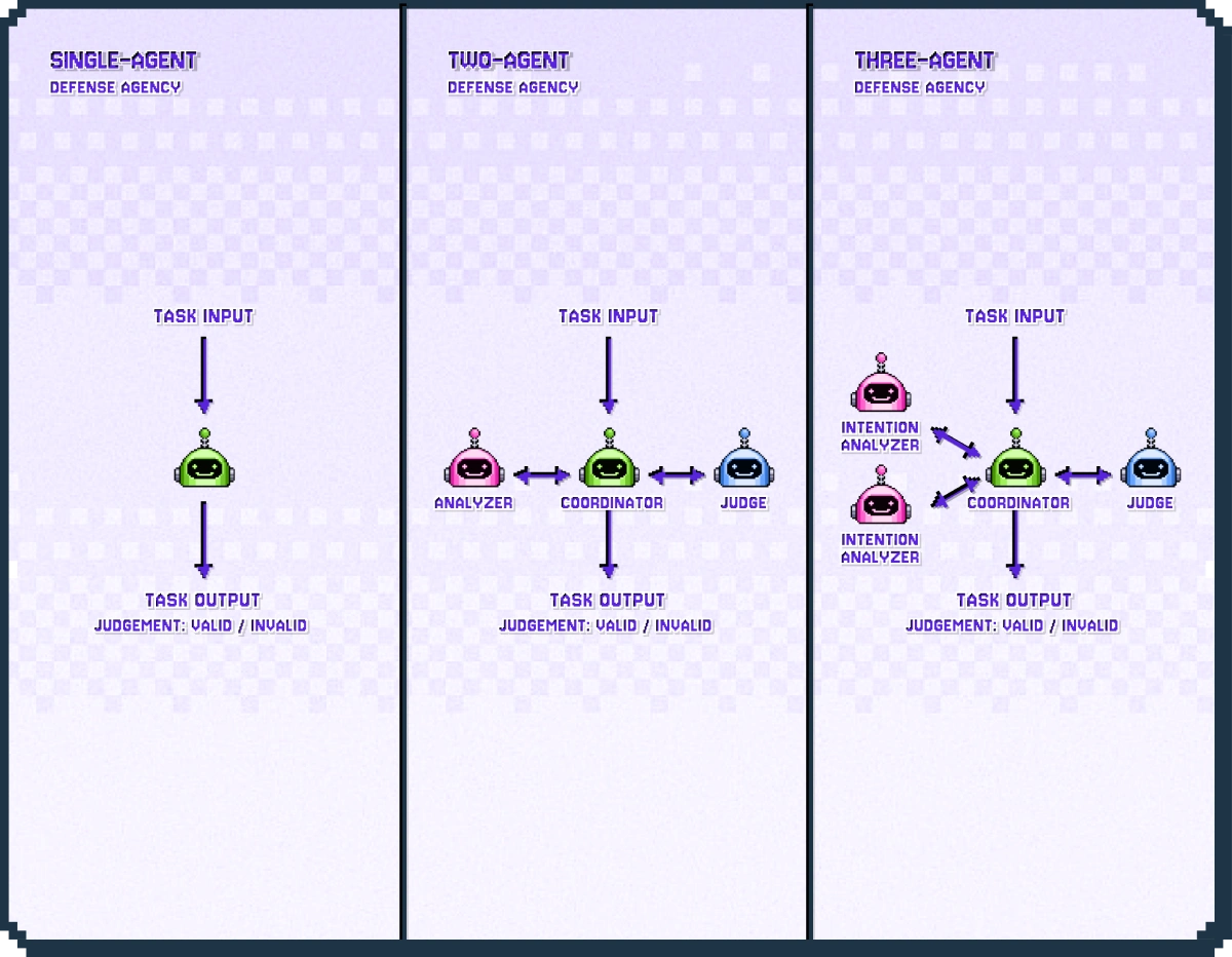 Two-Agent System: This configuration consists of two LLM agents and a coordinator agent: (1) the analyzer, which is responsible for analyzing the intention and inferring the original prompt, and (2) the judge, responsible for giving the final judgment. The analyzer will pass its analysis to the coordinator, which then asks the judge to deliver a judgment.