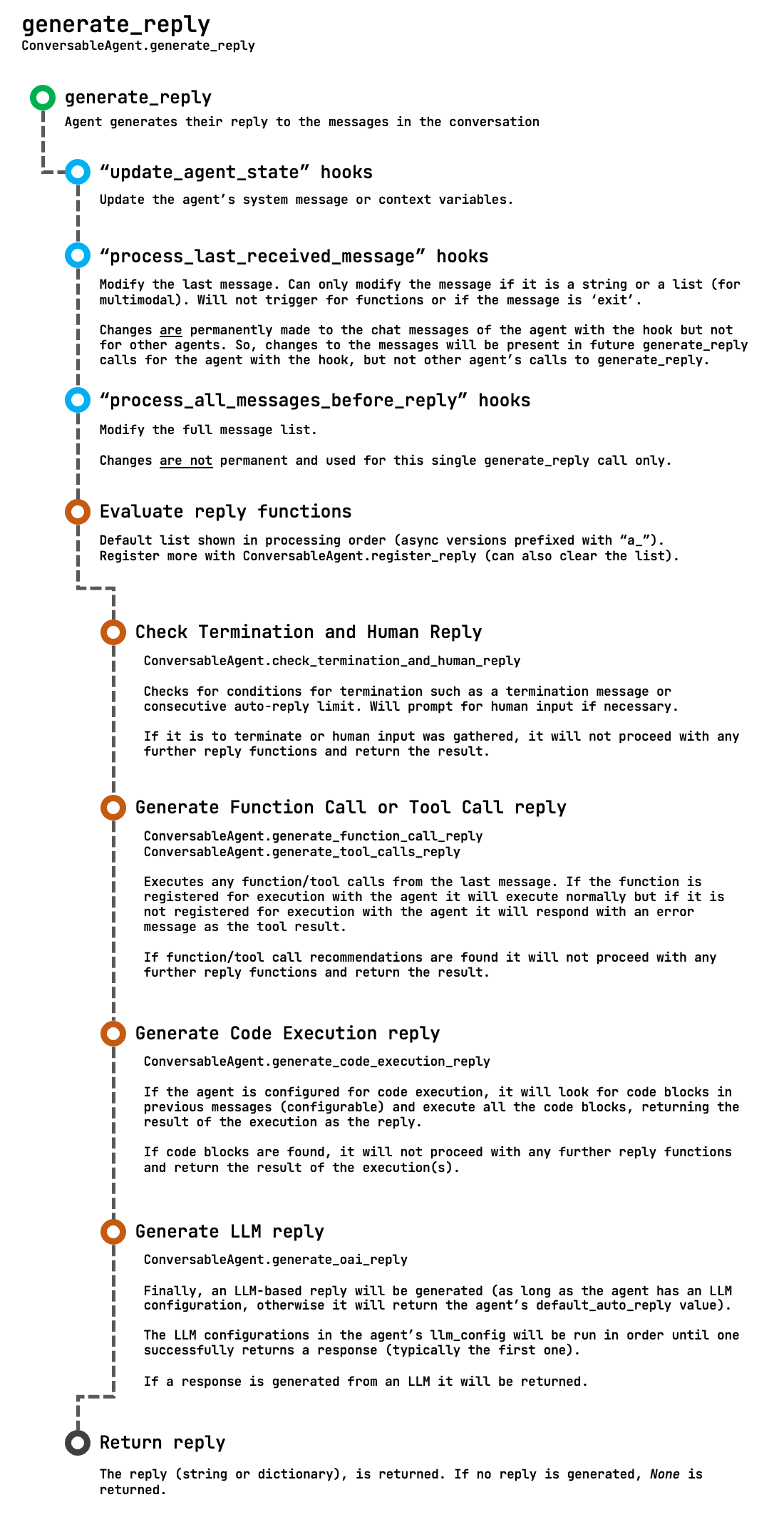The final step is the evaluation of the reply functions, these are done in order and the default functions are shown. Setting your own reply functions using ConversableAgent's register_reply method.